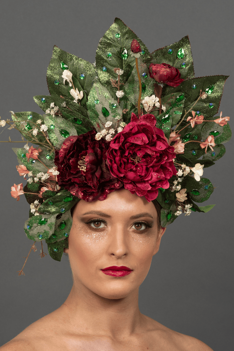 This iconic headpiece features layered green leaves with crystal embellishments, finished with large red fabric flowers and small floral accents arranged in a full crown design.