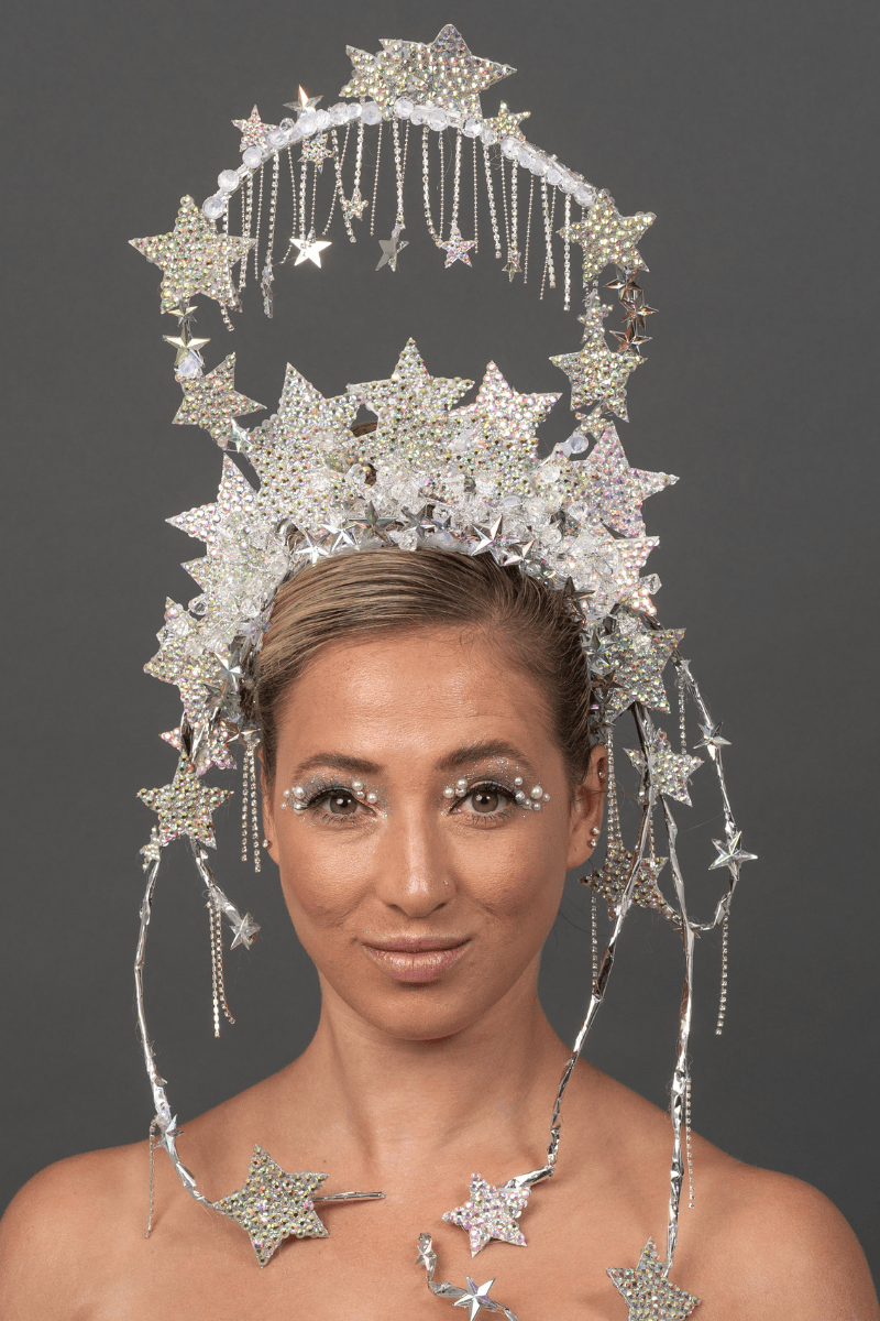 The Light Crown is a silver headpiece featuring layered crystal stars with hanging bead strands and a circular halo structure.