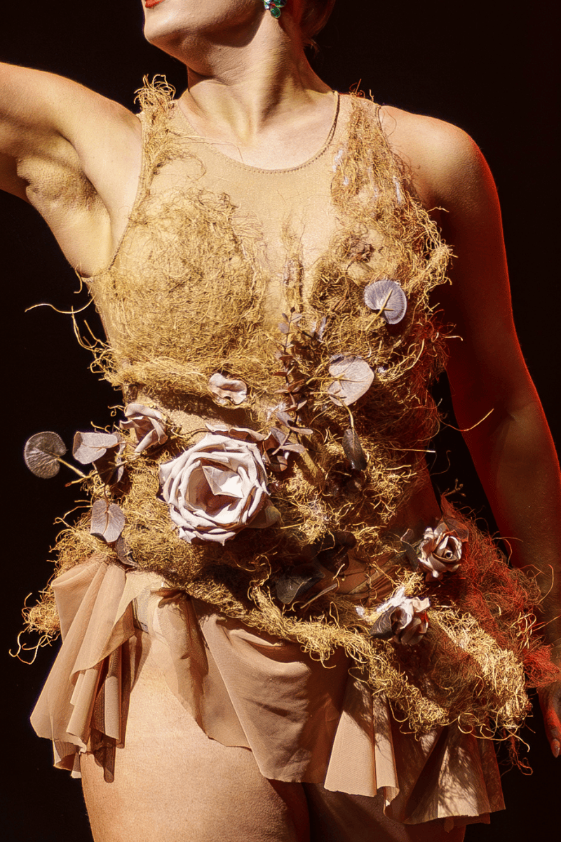 This costume is a nude-toned leotard with layered textured fibre detailing, fabric flowers, and leaf appliqué across the bodice and waist, finished with soft mesh panels and gathered skirt accents.