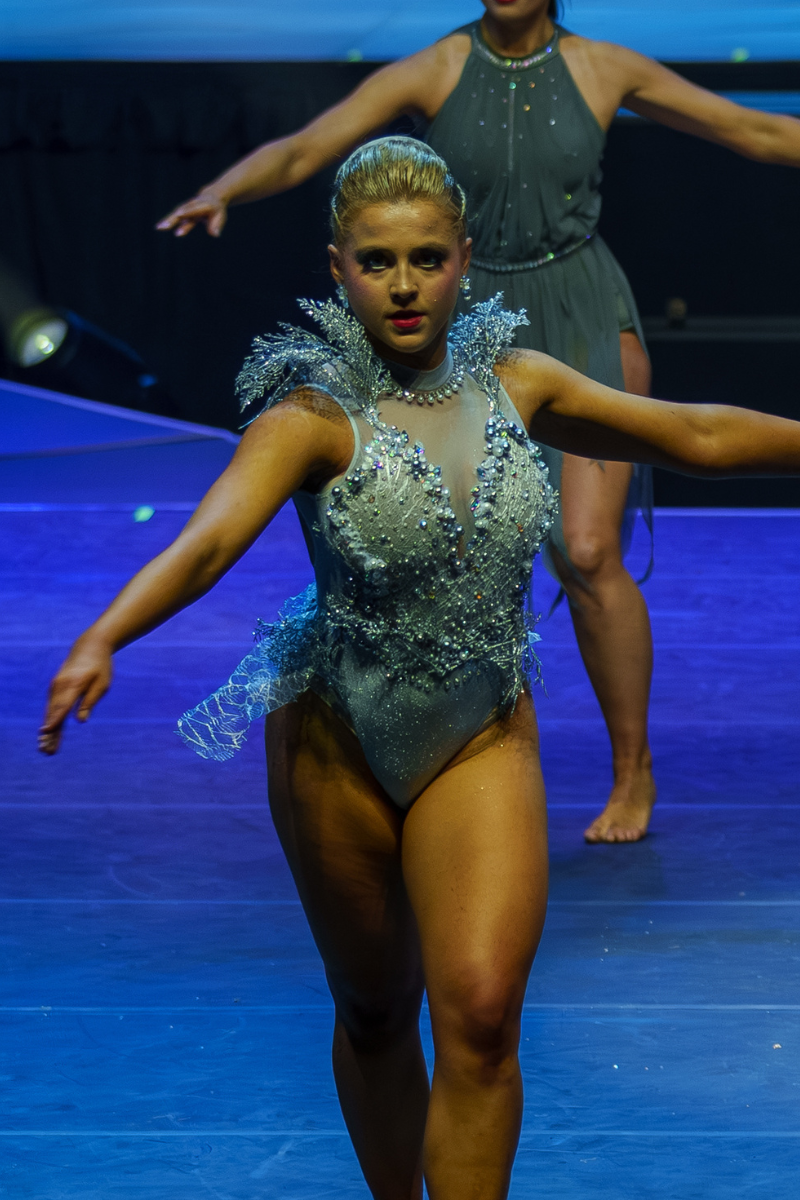 This costume is a pale blue leotard with sheer mesh panels, crystal embellishments, and textured shoulder detailing.